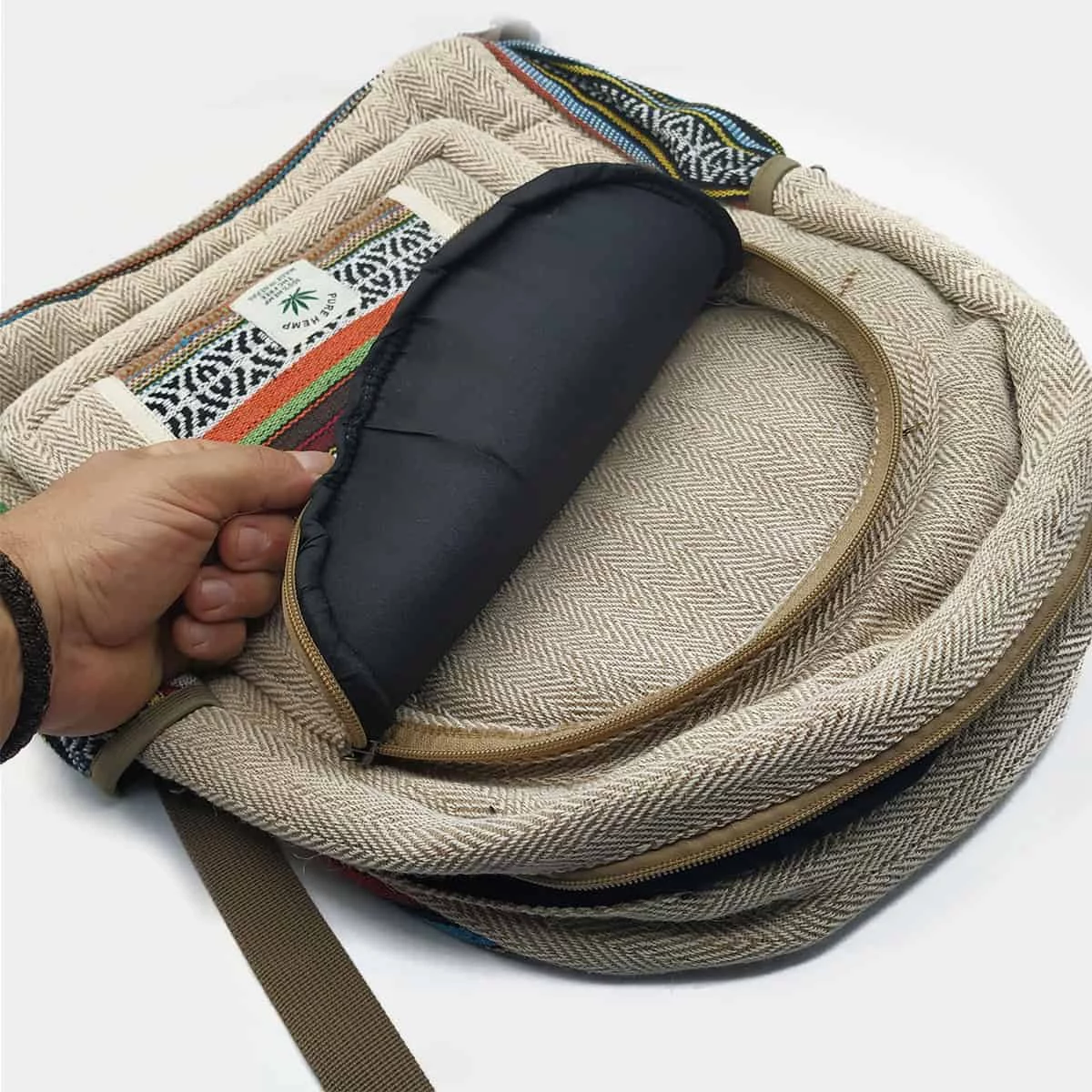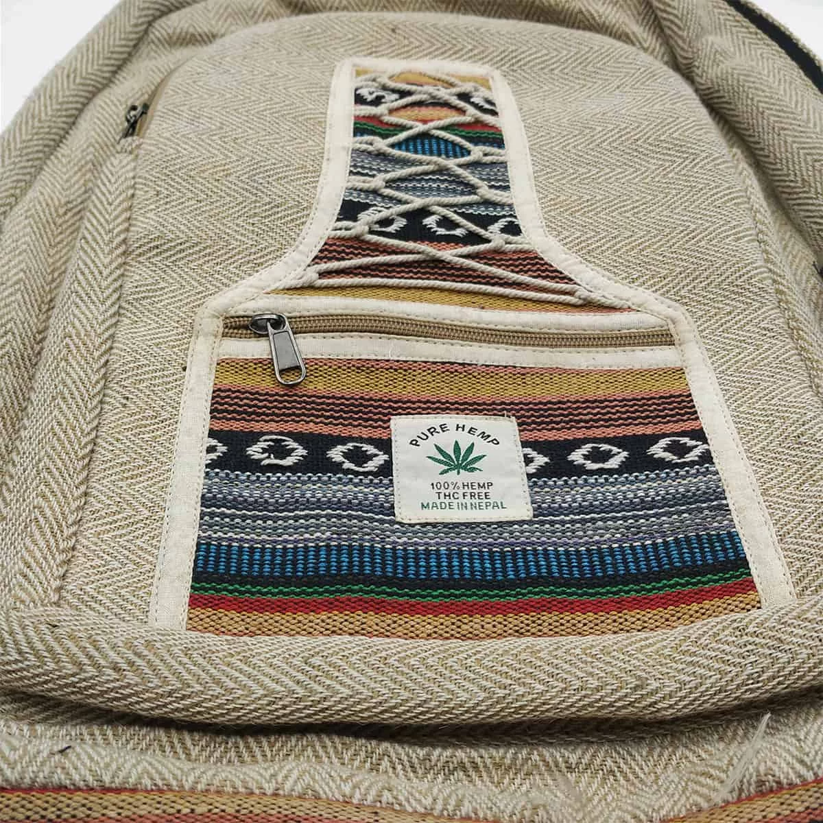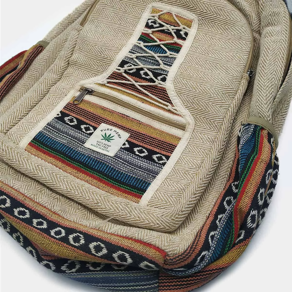 Esta Mochila em Cânhamo 100% Natural é feita à mão no Nepal usando cânhamo orgânico dos Himalaias e algodão. É amiga do ambiente e durável. É confortável de usar e muito leve de transportar, o que torna esta mochila perfeita para viagens.
